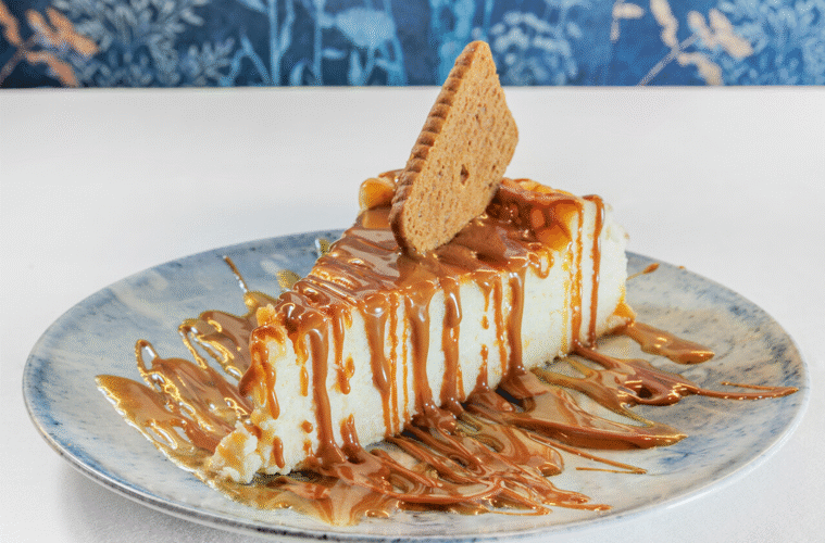 Tarta casera de manzana con masa crujiente, servida con una bola de helado de vainilla. Dulce y reconfortante.